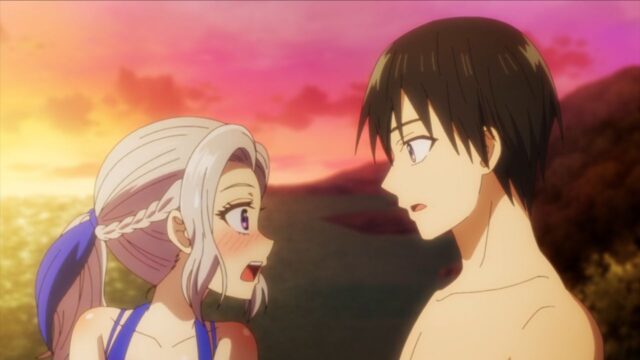 Shino starts to sneeze as her swimsuit is drenched, and it’s cold outside. Naoya tells her to take off the swimsuit, and he’ll turn around and start a fire for her. As he tries to start a fire, Shino leans on his back after taking the swimsuit off. Naoya is startled but doesn’t say anything.