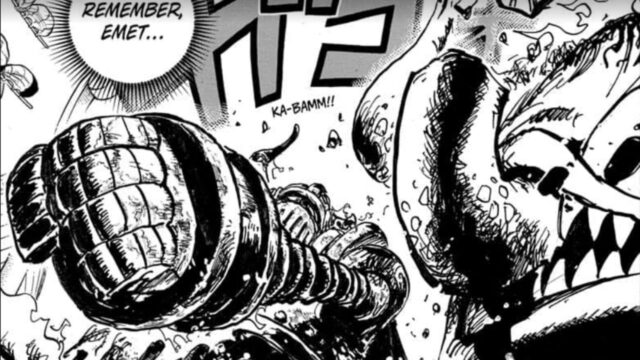 Later, Ju Peter charges at Emeth, but having an old body, Emeth fails to defend. This disappoints Luffy, Sanji, and Franky. The fight continues, resulting in one of Emeth’s arms getting eaten. However, Emeth holds Ju Peter back. Saturn jumps from Ju Peter to Elbaf ship. Saturn looks back at Kuma and Bonney.