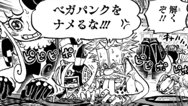 The manga proceeds to show another flashback, which happened 22 years ago when Vegapunk and Caesar received news that the Buster call destroyed Ohara. Even though Caesar says he wants to witness the massacre himself, Vegapunk is sad.