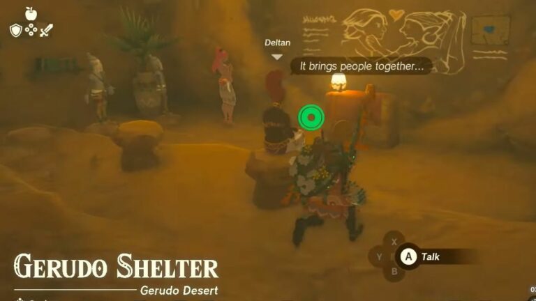 Once players enter the Gerudo Shelter, they will find a room in the back left where Ashai teaches a class on Gerudo and Voe relationships. During the class, one of the Gerudo vai named Deltan will have a specific line of dialogue that only appears when the player has the Ring Garland attached to them.