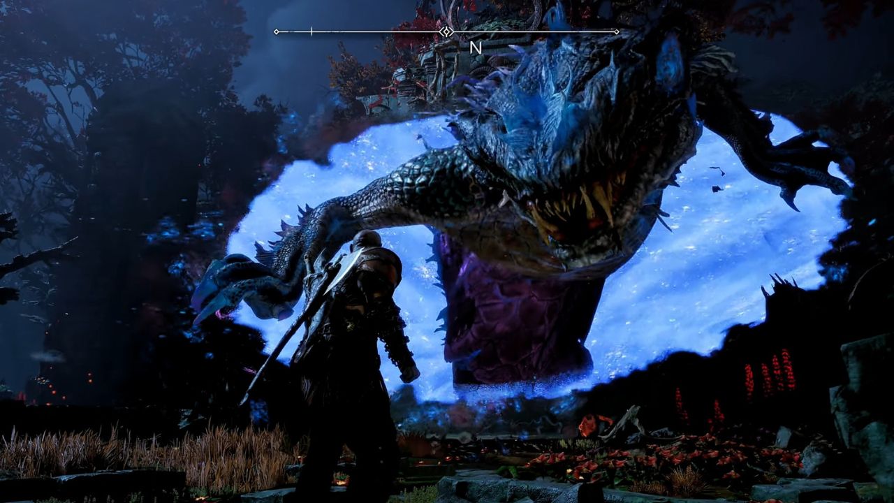 For the first phase of the boss fight, the creature will remain in its place and all you need to do is deal damage to its head as much as possible. The more damage you do, the easier it will be to get to the next phase. It will attempt to bite you and attack you with its tail, block those and dodge away from the shockwaves that it releases on the ground. Keep fighting it until an R3 prompt appears on top of its head and then you’ll be able to pull it out from the realm tear.