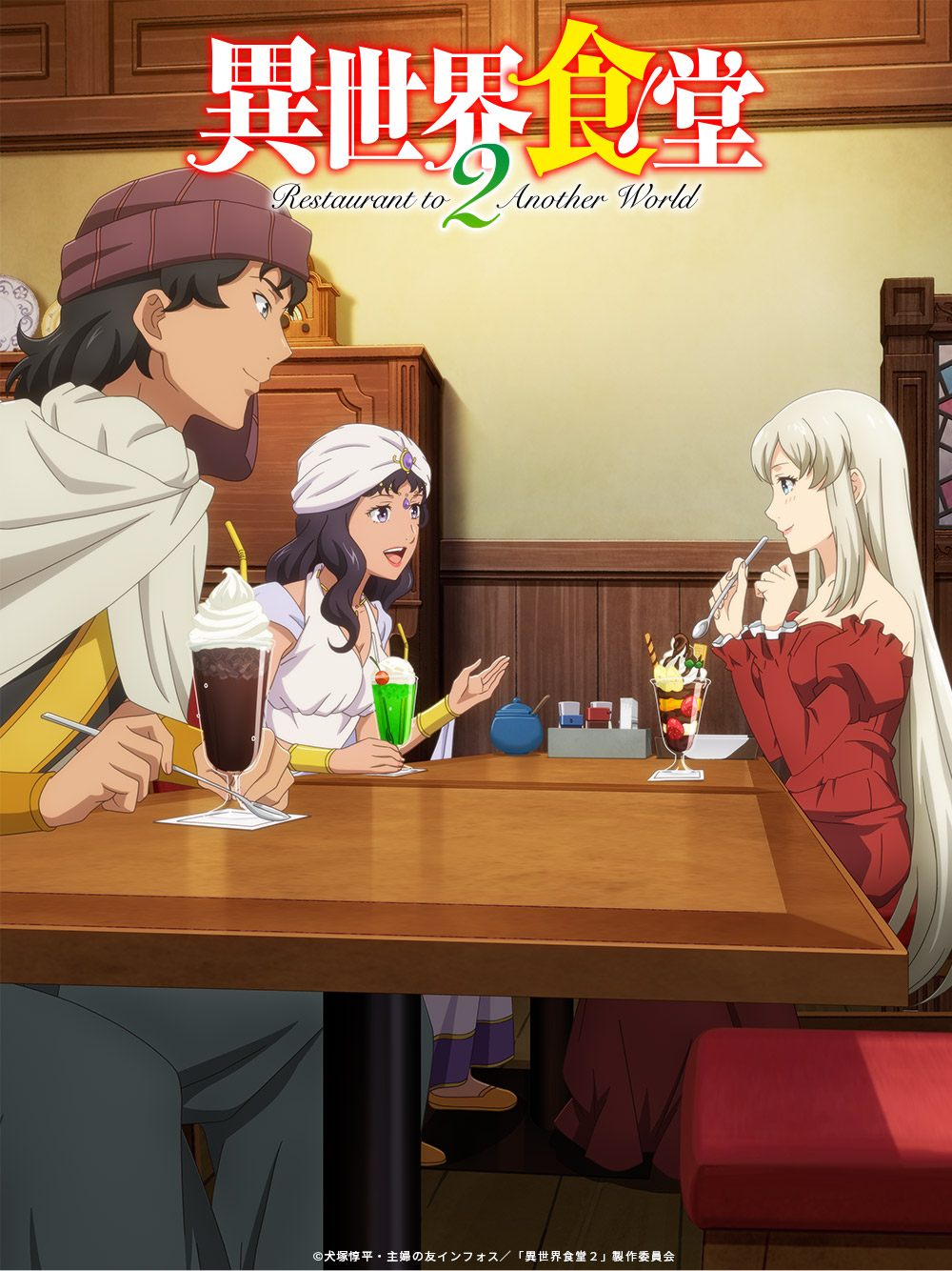 The visual features three recurring characters, Artorius, Tatsugorou, and Lionel, from the previous season. They are seen talking and enjoying servings of their favorite foods with some drinks.