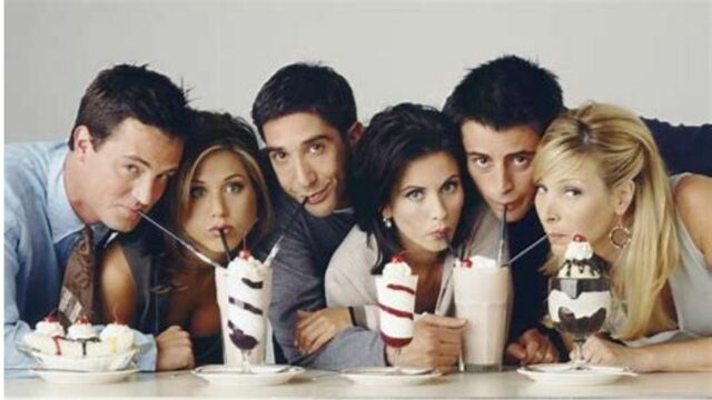 FRIENDS stars David Schwimmer, Jennifer Aniston, Courteney Cox, Matt LeBlanc, Matthew Perry, and Lisa Kudrow.